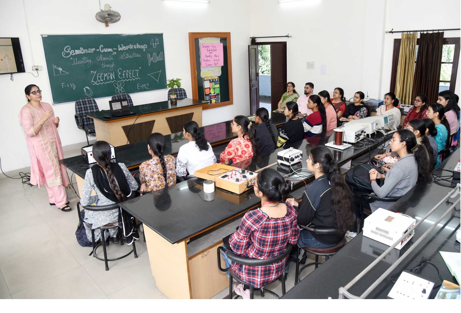 इस कार्यक्रम में स्नातकोत्तर एवं स्नातक विद्यार्थियों ने उत्साहपूर्वक भाग लिया। प्राचार्या डॉ. एकता खोसला तथा फिजिक्स एवं केमिस्ट्री विभाग के फैकल्टी सदस्यों ने मुख्य अतिथि का ग्रीन प्लांटर भेंट कर स्वागत किया। डॉ. सलोनी शर्मा, विभागाध्यक्ष, स्नातकोत्तर फिजिक्स विभाग ने विद्यार्थियों को सेमिनार के विषय से अवगत कराया, जबकि दीपशिखा, विभागाध्यक्ष, स्नातकोत्तर केमिस्ट्री विभाग ने मुख्य वक्ता का परिचय प्रस्तुत किया । डॉ. सुशील कुमार ने चंद्रयान वीपनेट क्लब की विभिन्न गतिविधियों पर प्रकाश डाला। सेमिनार की शुरुआत जीमैन प्रभाव के महत्व पर आधारित परिचय से हुई, जिसमें परमाणु संरचना और स्पेक्ट्रोस्कोपी को समझने में इसकी भूमिका को रेखांकित किया गया। डॉ. कौर ने अपने व्याख्यान में जीमैन प्रभाव के सैद्धांतिक पहलुओं को विस्तार से समझाया, जिसमें सामान्य एवं असामान्य स्पेक्ट्रल रेखाओं का चुंबकीय क्षेत्र की उपस्थिति में विभाजन शामिल था। उन्होंने जीमैन प्रभाव के विभिन्न अनुप्रयोगों जैसे-चंद्रमा के चुंबकीय क्षेत्र का निर्धारण, परमाणु ऊर्जा स्तरों का अध्ययन तथा मैग्नेटिक रेजोनेंस तकनीकों पर भी चर्चा की। कार्यशाला सत्र के दौरान, उन्होंने जीमैन प्रभाव उपकरण का विस्तृत प्रदर्शन किया। प्रतिभागियों को उपकरण के निर्माण, कार्य सिद्धांत एवं कैलिब्रेशन तकनीकों के बारे में मार्गदर्शन दिया गया। इस व्यावहारिक अनुभव से विद्यार्थियों को यह समझने में सहायता मिली कि किस प्रकार चुंबकीय क्षेत्र परमाणु ऊर्जा स्तरों और स्पेक्ट्रल उत्सर्जन को प्रभावित करता है। यह सत्र अत्यंत संवादात्मक रहा, जिसमें प्रतिभागियों ने सक्रिय रूप से प्रश्न पूछे और अपनी जिज्ञासाओं का समाधान किया। इस प्रायोगिक प्रदर्शन ने उनकी वैचारिक समझ को सुदृढ़ किया तथा उन्हें महत्वपूर्ण प्रयोगात्मक जानकारी प्रदान की। प्राचार्या डॉ. एकता खोसला ने अपने संदेश में कहा कि इस प्रकार के सेमिनार एवं कार्यशालाएँ विद्यार्थियों के शैक्षणिक विकास में महत्वपूर्ण भूमिका निभाती हैं। उन्होंने कहा कि जीमैन प्रभाव जैसे जटिल वैज्ञानिक सिद्धांतों को समझने के लिए इस प्रकार की व्यावहारिक गतिविधियाँ अत्यंत आवश्यक हैं। उन्होंने विद्यार्थियों को प्रोत्साहित किया कि वे ऐसे अवसरों का अधिकतम लाभ उठाकर अपने ज्ञान और शोध कौशल को विकसित करें तथा विज्ञान के क्षेत्र में नवाचार की दिशा में अग्रसर हों। कार्यक्रम का समापन धन्यवाद ज्ञापन के साथ हुआ, जिसमें डॉ. दलजीत कौर के ज्ञानवर्धक सत्र एवं सभी प्रतिभागियों की सक्रिय सहभागिता के लिए आभार व्यक्त किया गया। यह सेमिनार – सह – कार्यशाला अत्यंत ज्ञानवर्धक एवं उपयोगी सिद्ध हुई, जिसने प्