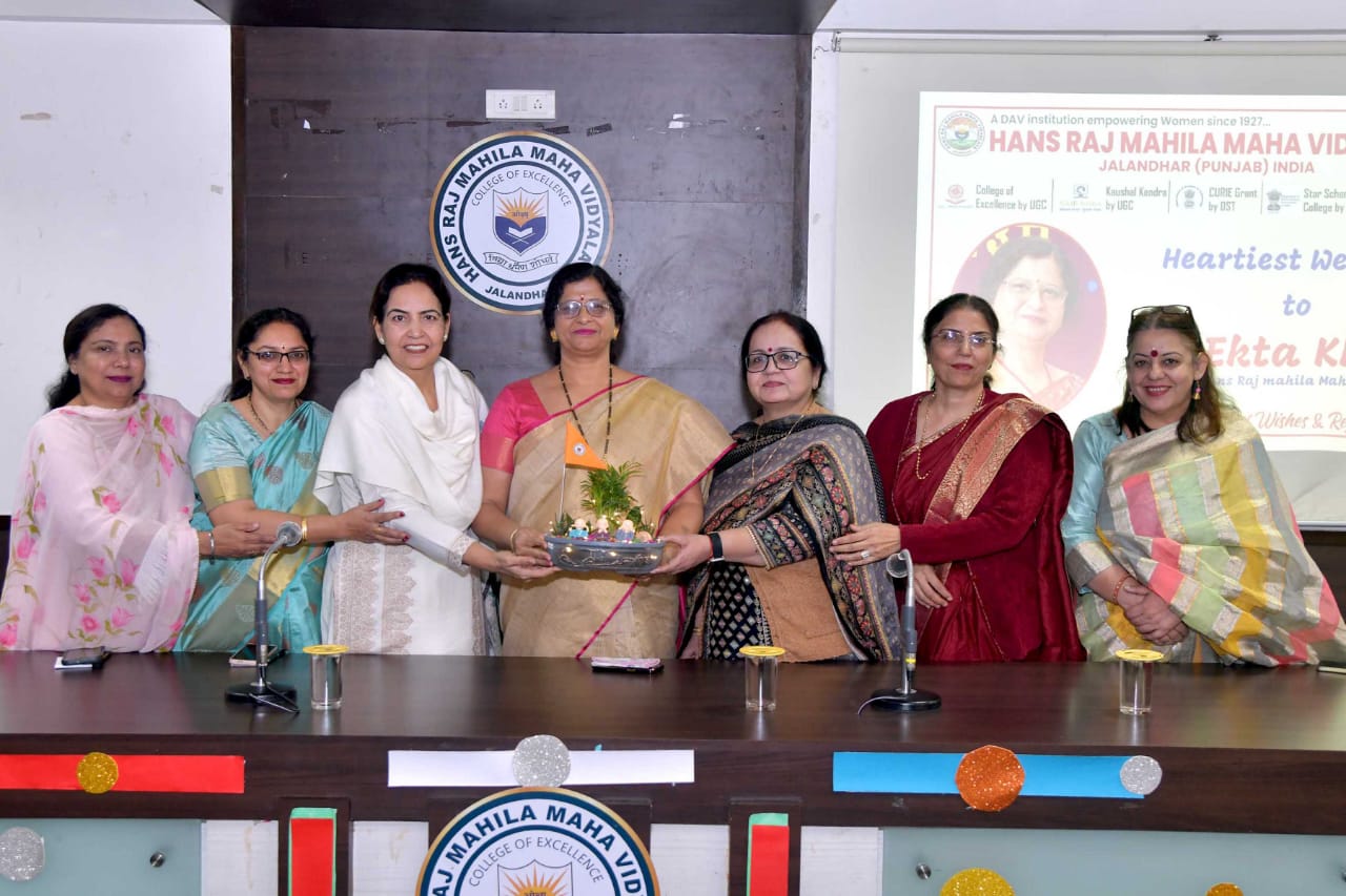 प्राचार्या डॉ. एकता खोसला ने सर्वप्रथम इस आयोजन के लिए आभार व्यक्त किया और कहा कि एचएमवी में वापिस आकर वह स्वयं में गौरवान्वित महसूस कर रही हैं। उन्होंने कहा कि एचएमवी को उत्तरी भारत के सर्वोच्च संस्थान के रूप में जाना जाता है। एचएमवी महात्मा हंसराज जी, महर्षि दयानंद जी और डीएवीसीएमसी अध्यक्ष डॉ. पूनम सूरी जी का स्वप्न है और उसी स्वप्न को और अधिक बुलंदियों तक पहुंचाने के लिए हम सभी टीम एचएमवी के रूप में इस संस्थान को पूरे देश का सर्वोच्च संस्थान बनाने के लिए मिलकर काम करेंगे। इस अवसर पर संगीत विभाग ने गुलदस्ता के रूप में गीत प्रस्तुत किए। डॉ. सलोनी शर्मा ने धन्यवाद प्रस्ताव प्रस्तुत किया और एचएमवी परिवार की ओर से पूर्ण सहयोग का आश्वासन दिया ।