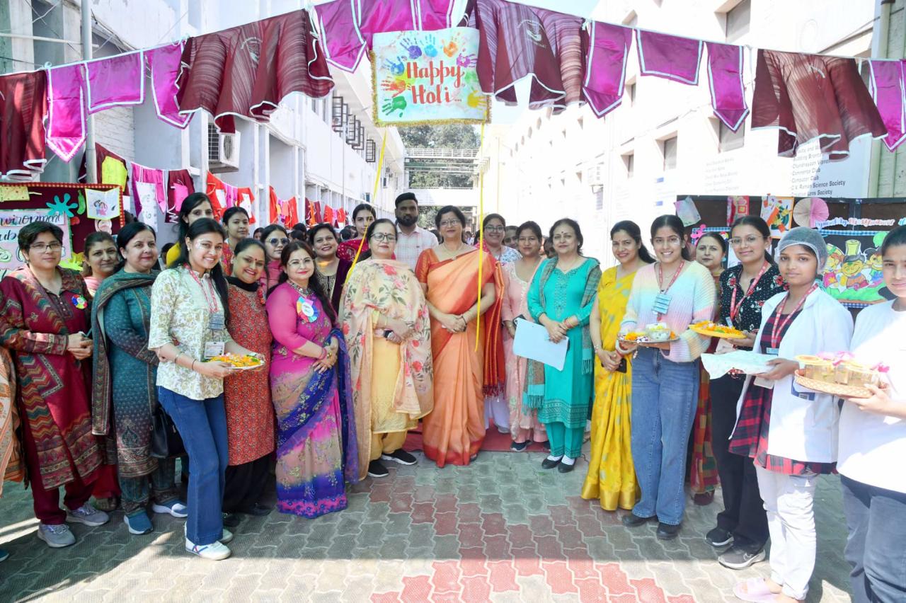 प्रतिभागियों की सृजनात्मकता और उत्साह न पूरे परिसर को उत्सवमय बना दिया। इस अवसर पर कई आकर्षक गतिविधियाँ भी आयोजित की गईं, जिनमें कलर रेवोल्यूशन, ऑर्गेनिक कलर स्टॉल, वाइब्रेंट वाइब्स : टाई एंड डाई गारमेंट्स, होलिहाट : होम डेकोर, होली पकवान कॉर्नर, सेल्फी कॉर्नर, सजावट कॉर्नर तथा टैटू और फेस पेंटिंग कॉर्नर विशेष आकर्षण का केंद्र रहे। इन गतिविधियों ने छात्राओं को न केवल मनोरंजन का अवसर दिया, बल्कि पर्यावरण के अनुकूल उत्पादों के उपयोग के प्रति भी प्रेरित किया। कार्यक्रम का सफल संचालन फैशनिस्टा क्लब की इंचार्ज नवनीता तथा एनवायरनमेंट क्लब की इंचार्ज डॉ. साक्षी वर्मा के मार्गदर्शन में किया गया। प्राचार्या डॉ. एकता खोसला ने छात्राओं के उत्साह और रचनात्मकता की सराहना करते हुए कहा कि इस प्रकार के आयोजन विद्यार्थियों में पर्यावरण के प्रति जिम्मेदारी और सकारात्मक सोच को विकसित करते हैं। प्राचार्या डॉ. एकता खोसला ने ईको-रंग उत्सव के सफल आयोजन पर प्रसन्नता व्यक्त करते हुए कहा कि ऐसे कार्यक्रम विद्यार्थियों में सांस्कृतिक मूल्यों और पर्यावरण के प्रति संवेदनशीलता को विकसित करते हैं। उन्होंने कहा कि होली जैसे पारंपरिक त्योहार को प्राकृतिक और पर्यावरण-अनुकूल तरीके से मनाने का संदेश समाज के लिए अत्यंत महत्वपूर्ण है। उन्होंने एनवायरनमेंट क्लब और फैशनिस्टा क्लब के प्रयासों की सराहना करते हुए कहा कि इस प्रकार की गतिविधियाँ छात्राओं को जागरूक, जिम्मेदार और सृजनशील नागरिक बनने के लिए प्रेरित करती हैं। प्राचार्या ने सभी प्रतिभागियों और आयोजकों को बधाई दी तथा भविष्य में भी ऐसे नवाचारी कार्यक्रम आयोजित करने के लिए प्रोत्साहित किया। कार्यक्रम में बड़ी संख्या में छात्राओं ने भाग लिया और पूरे उत्साह के साथ ईको-फ्रेंडली होली का संदेश समाज तक पहुँचाने का संकल्प लिया। यह आयोजन विद्यार्थियों के लिए ज्ञान, रचनात्मकता और आनंद का सुंदर संगम सिद्ध हुआ ।